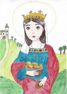 Święta Elżbieta Węgierska urodziła się w 1207 roku w Bratysławie lub na zamku w Saraspotah jako trzecie dziecko Andrzeja II (króla Węgier) i Gertrudy (siostry św. Jadwigi Śląskiej) Wyszła za mąż mając  14 lat za Ludwika IV.  Urodziła troje dzieci: Hermana, Zofię i Gertrudę. Została wdową mając 20 lat, gdy jej mąż zmarł podczas wyprawy krzyżowej we Włoszech. Zgodnie z frankońskim prawem spadkowym opuściła z dziećmi zamek w Wartburgu i zamieszkała najpierw w pobliskim Eisenach, a następnie w Marburgu, gdzie ufundowała szpital, w którym sama chętnie usługiwała. Oddała się wychowaniu dzieci, modlitwie, uczynkom pokuty i miłosierdzia. W 1228 roku Elżbieta złożyła ślub wyrzeczenia się świata i przyjęła jako jedna z pierwszych habit tercjarki św.  Franciszka. Ostatnie lata spędziła w skrajnym ubóstwie, oddając się bez reszty chorym i biednym. Zmarła w nocy z 16 na 17 listopada 1231 roku. Sława jej świętości była tak wielka, że na jej grób zaczęły przychodzić  pielgrzymki, gdzie działo się wiele cudów uzdrowienia. Po czterech latach papież Grzegorz IX ogłosił uroczyście Elżbietę świętą. Jest patronką elżbietanek (zgromadzenia założonego w Nysie w 1842 roku), elżbietanek cieszyńskich (założonych w XVI w. w Akwizgranie) oraz Franciszkańskiego Zakonu Świeckich. Jest także Patronką Niemiec i Węgier. Jej imię przyjęło jako swoją nazwę kilka zgromadzeń zakonnych i dzieł katolickich. Jest patronką ubogich i patronką dzieł miłosierdzia. W ikonografii  św. Elżbieta przedstawiana jest w stroju królewskim, albo z naręczem róż w fartuchu. Powstała bowiem legenda, że mąż zakazał jej rozdawać ubogim pieniądze i chleb. Gdy pewnego czasu przyłapał ją na wynoszeniu bułek w fartuchu i kazał jej pokazać co niesie, zobaczył róże, mimo, że była to zima. Jej atrybutami  są także kilka monet i różaniec.